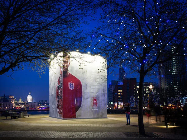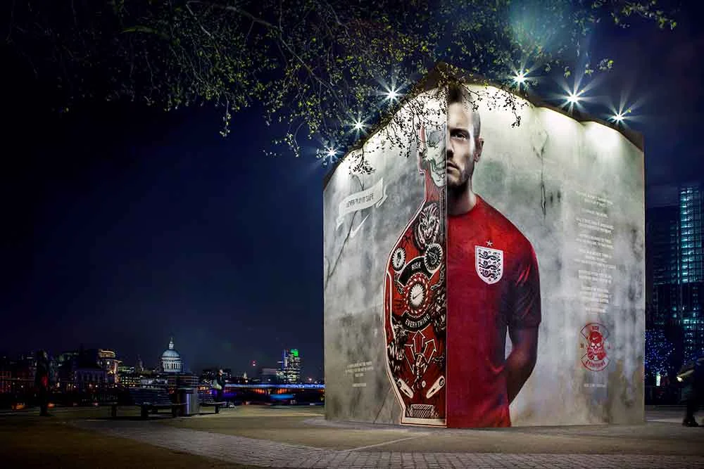 Southbank: 8,000 sq ft mural structure erected beside Thames River for England shirt launch, featuring Wayne Rooney and Jack Wilshere.