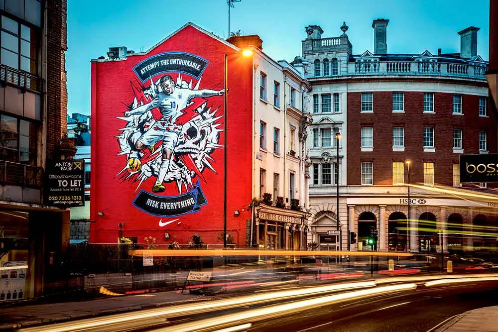 As the England Football team prepared for 2014’s FIFA World Cup, one question was on the tip of every fan's tongue: “What are they going to wear?!” ...well, some fans. And for those, High Rise joined forces with Nike Football to paint kit launch murals across London. Designed by creative lab, ILoveDust, the campaign featured both photography and illustration, giving High Rise a range of styles to execute.